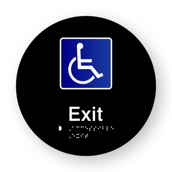 Accessible Exit Braille Sign on a Tactile Printed Black Acrylic Disk