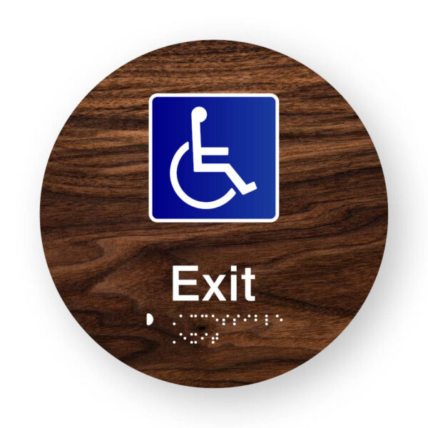 Accessible Exit Braille Sign on a Tactile Printed Dark Woodgrain Acrylic Disk