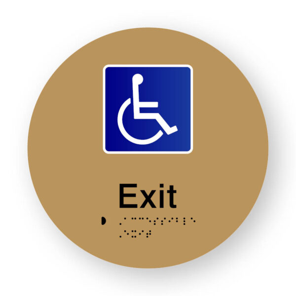 Accessible Exit Braille Sign on a Tactile Printed Gold Acrylic Disk