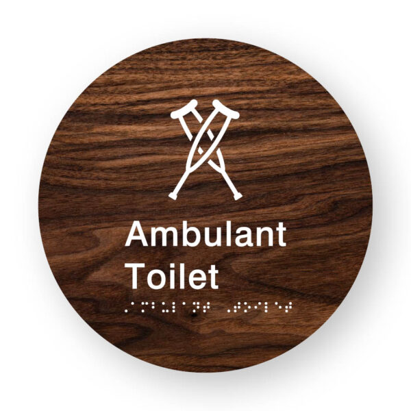 Ambulant Toilet Braille Sign on a Tactile Printed Dark Woodgrain Acrylic Disk