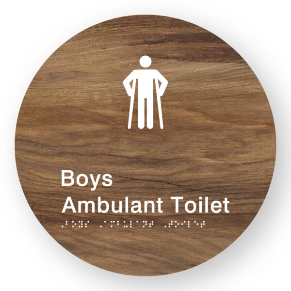 Boys Ambulant Toilet Braille Sign on a Tactile Printed Mid-Woodgrain Acrylic Disk