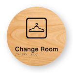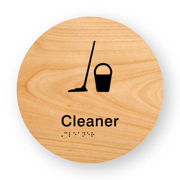 Cleaner Braille Sign on a Tactile Printed Woodgrain Acrylic Disk