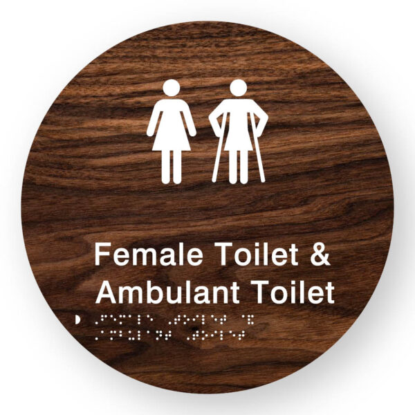 Female Toilet & Ambulant Toilet Braille Sign on a Tactile Printed Dark Woodgrain Acrylic Disk
