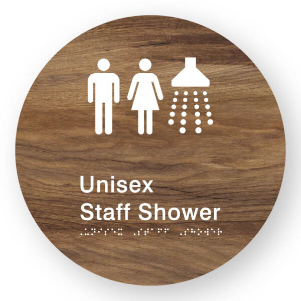 Unisex Staff Shower Braille Sign on a Tactile Printed Mid-Woodgrain Acrylic Disk