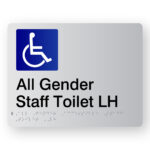 This Accessible Entrance with left arrow Braille sign in Silver acrylic is a mandatory statutory signage requirement for public buildings. Compliant with Australian standards & NCC requirements, it features Grade 1 uncontracted Braille, tactile text & graphics, ensuring it effectively indicates sanitary facilities.
