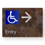 Production Method: BrailleFace – Using our patented BrailleFace production method, each Braille sign will be formed from a single piece of metal creating a compliant continuous face, soft to touch Braille Tactile Sign with no parts adhered to the surface of the sign in any way. As a result, the signs construction will deter vandalism & the sign face has no joins to harbour bacteria. Each Braille sign is made from a single sheet of distressed metal printed aluminium with silver finish text and/or figures.