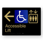 Accessible Lift (Right Arrow) Braille Sign in a Black & Satin Brass Finish