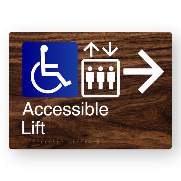 Accessible Lift (Right Arrow) Braille Sign in a Dark Woodgrain
