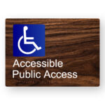 Production Method: BrailleFace – Using our patented BrailleFace production method, each Braille sign will be formed from a single piece of metal creating a compliant continuous face, soft to touch Braille Tactile Sign with no parts adhered to the surface of the sign in any way. As a result, the signs construction will deter vandalism & the sign face has no joins to harbour bacteria. Each Braille sign is made from a single sheet of dark woodgrain printed aluminium with white printed text and/or figures.