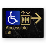 Production Method: BrailleFace – Using our patented BrailleFace production method, each Braille sign will be formed from a single piece of metal creating a compliant continuous face, soft to touch Braille Tactile Sign with no parts adhered to the surface of the sign in any way. As a result, the signs construction will deter vandalism & the sign face has no joins to harbour bacteria. Each Braille sign is made from a single sheet of black marble printed aluminium with satin brass finish text and/or figures.