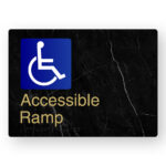 Production Method: BrailleFace – Using our patented BrailleFace production method, each Braille sign will be formed from a single piece of metal creating a compliant continuous face, soft to touch Braille Tactile Sign with no parts adhered to the surface of the sign in any way. As a result, the signs construction will deter vandalism & the sign face has no joins to harbour bacteria. Each Braille sign is made from a single sheet of black marble printed aluminium with satin brass finish text and/or figures.