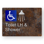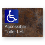 Accessible Toilet LH & Baby Change Braille Sign in a Distressed Metal Finish