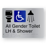 All Gender Accessible Toilet LH Shower & Baby Change Braille Sign in Stainless Steel