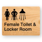 This Female Toilet Braille Sign in Woodgrain acrylic is a mandatory statutory signage requirement for public buildings. Compliant with Australian standards & NCC requirements, it features Grade 1 uncontracted Braille, tactile text & graphics, ensuring it effectively indicates sanitary facilities.