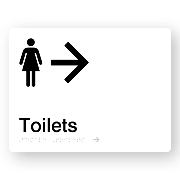 Female Toilets (Right Arrow) Braille Sign in White Acrylic