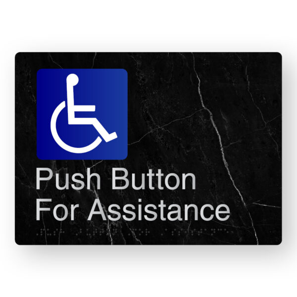 Push Button For Assistance Braille Sign in a Black Marble & Silver Finish
