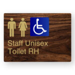 Staff Unisex Toilet & Ambulant Toilet Braille Sign in a Dark Woodgrain & Brass Finish