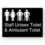 Production Method: BrailleFace – Using our patented BrailleFace production method, each Braille sign will be formed from a single piece of metal creating a compliant continuous face, soft to touch Braille Tactile Sign with no parts adhered to the surface of the sign in any way. As a result, the signs construction will deter vandalism & the sign face has no joins to harbour bacteria. Each Braille sign is made from a single sheet of satin 2pac black aluminium with the raised text printed white.