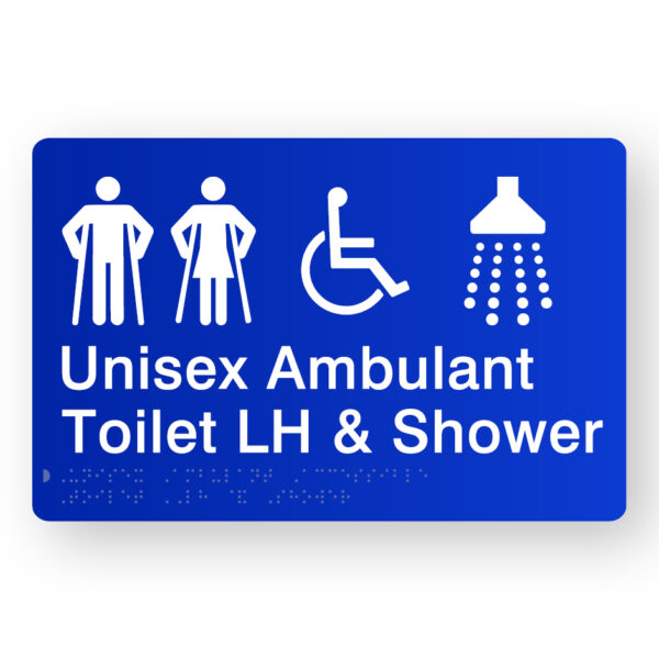 Unisex Ambulant Accessible Toilet LH & Shower Braille Sign in Blue Acrylic