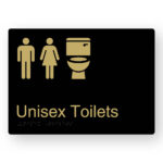 Production Method: BrailleFace – Using our patented BrailleFace production method, each Braille sign will be formed from a single piece of metal creating a compliant continuous face, soft to touch Braille Tactile Sign with no parts adhered to the surface of the sign in any way. As a result, the signs construction will deter vandalism & the sign face has no joins to harbour bacteria. Each Braille sign is made from a single sheet of black printed aluminium with satin brass finish text and/or figures.