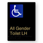 Production Method: BrailleFace – Using our patented BrailleFace production method, each Braille sign will be formed from a single piece of metal creating a compliant continuous face, soft to touch Braille Tactile Sign with no parts adhered to the surface of the sign in any way. As a result, the signs construction will deter vandalism & the sign face has no joins to harbour bacteria. Each Braille sign is made from a single sheet of black aluminium with the text and/or figures having a satin brass finish.