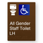 Production Method: BrailleFace – Using our patented BrailleFace production method, each Braille sign will be formed from a single piece of metal creating a compliant continuous face, soft to touch Braille Tactile Sign with no parts adhered to the surface of the sign in any way. As a result, the signs construction will deter vandalism & the sign face has no joins to harbour bacteria. Each Braille sign is made from a single sheet of bronze aluminium with the text and/or figures printed white.