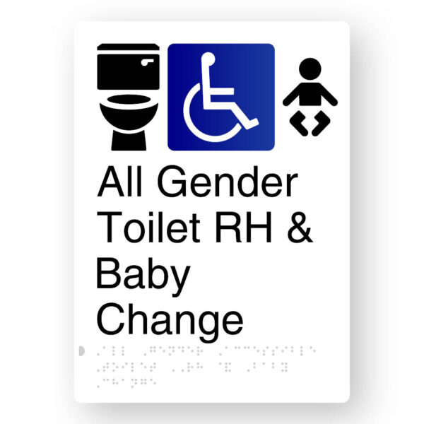 All Gender Accessible Toilet RH & Baby Change Braille Sign in Portrait White Aluminium