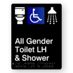 This All-Gender Toilet Braille Sign in portrait black acrylic is a mandatory statutory signage requirement for public buildings. Compliant with Australian standards & NCC requirements, it features Grade 1 uncontracted Braille, tactile text & graphics, ensuring it effectively indicates sanitary facilities.