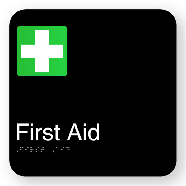 First Aid Braille Sign in Square Black Acrylic